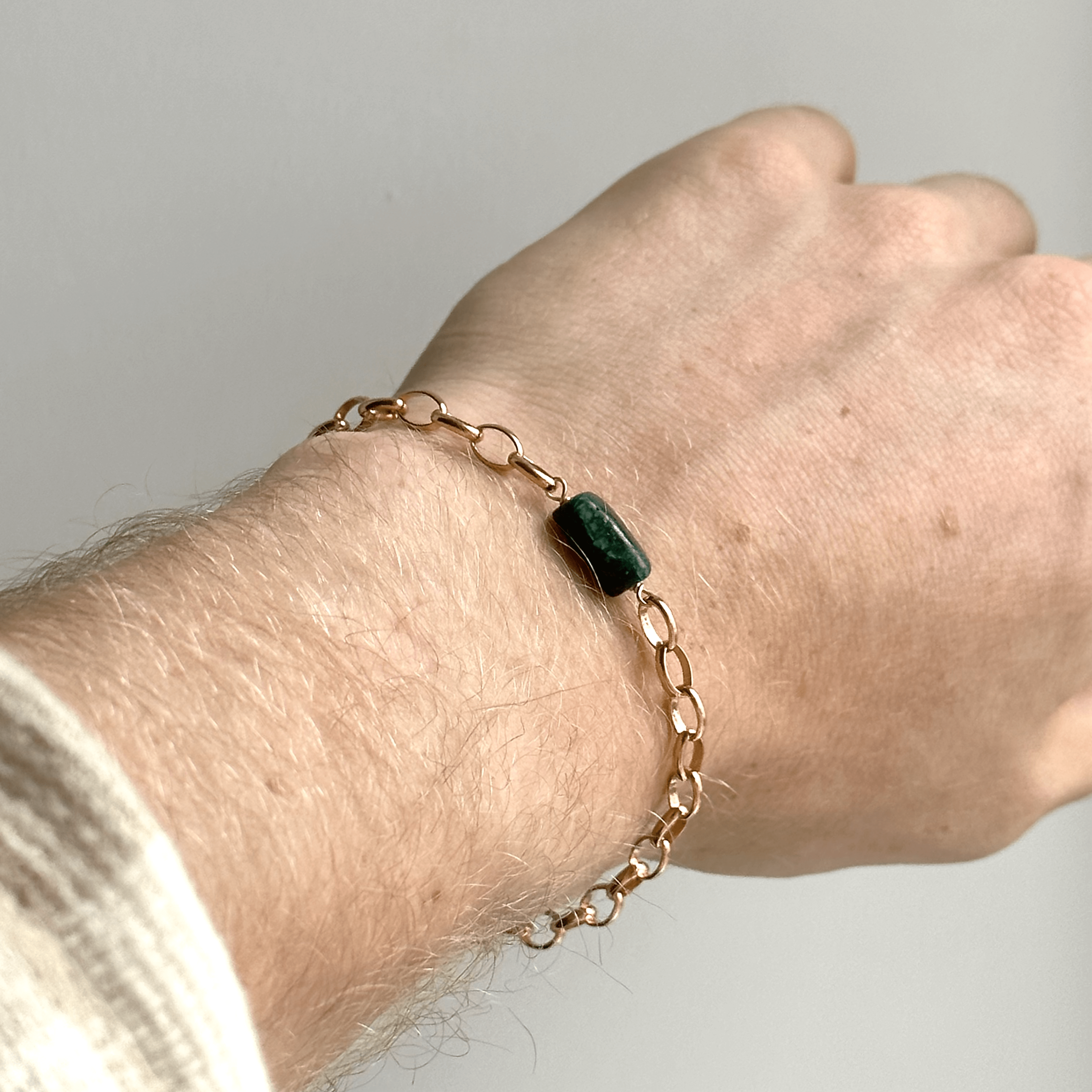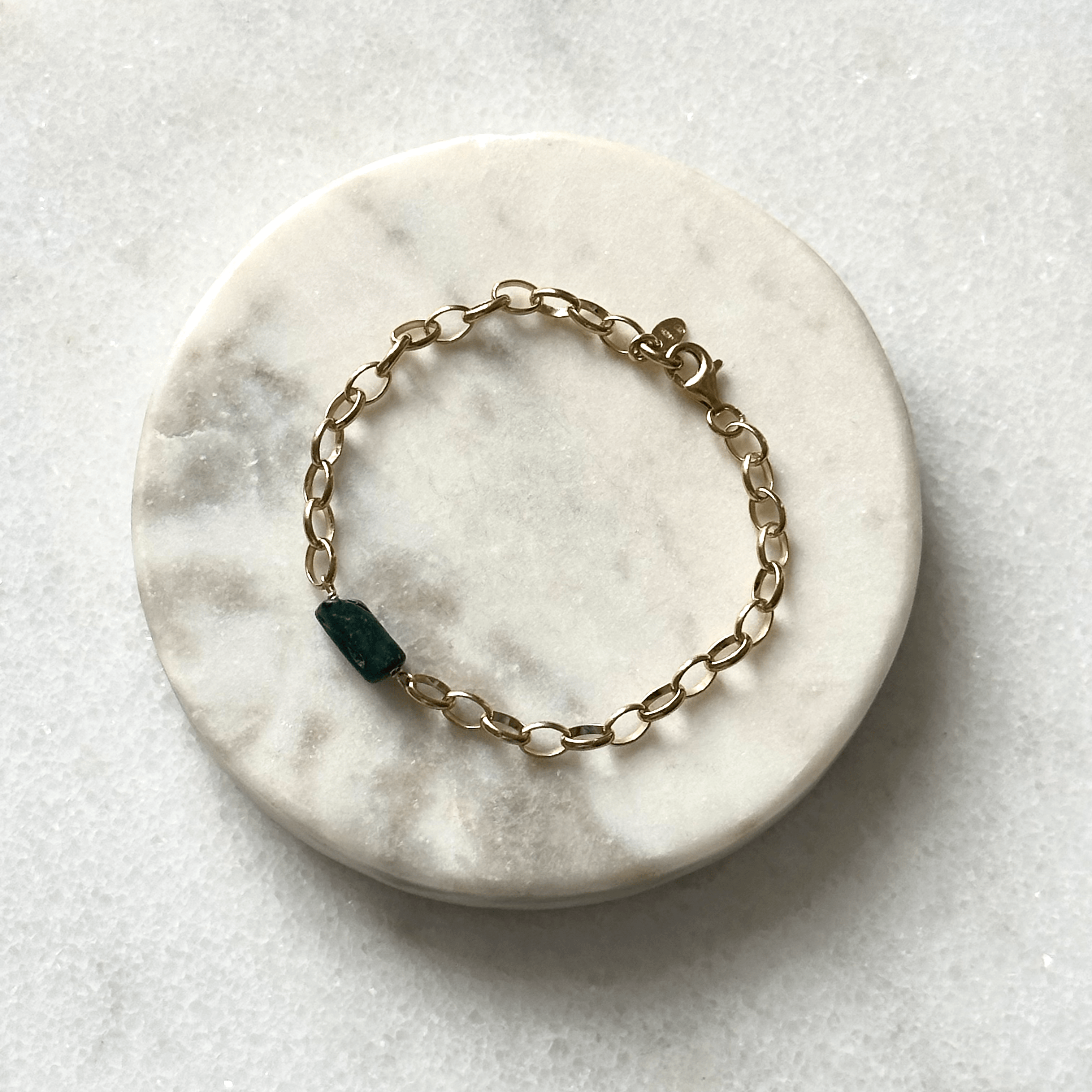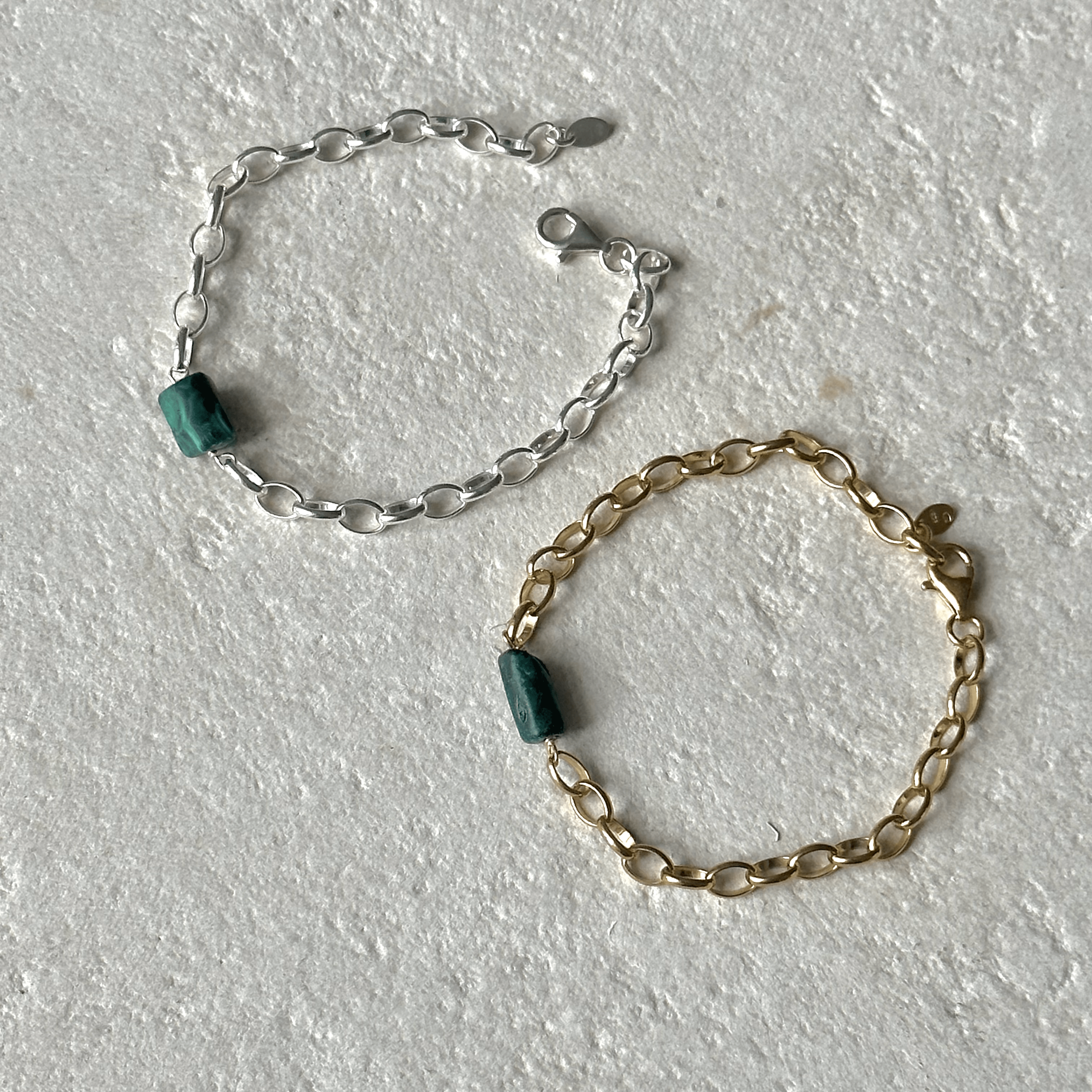 Bransoletka składa się z malachitu oraz srebrnego łańcucha (próba 925), pozłacanego 24-karatowym złotem.