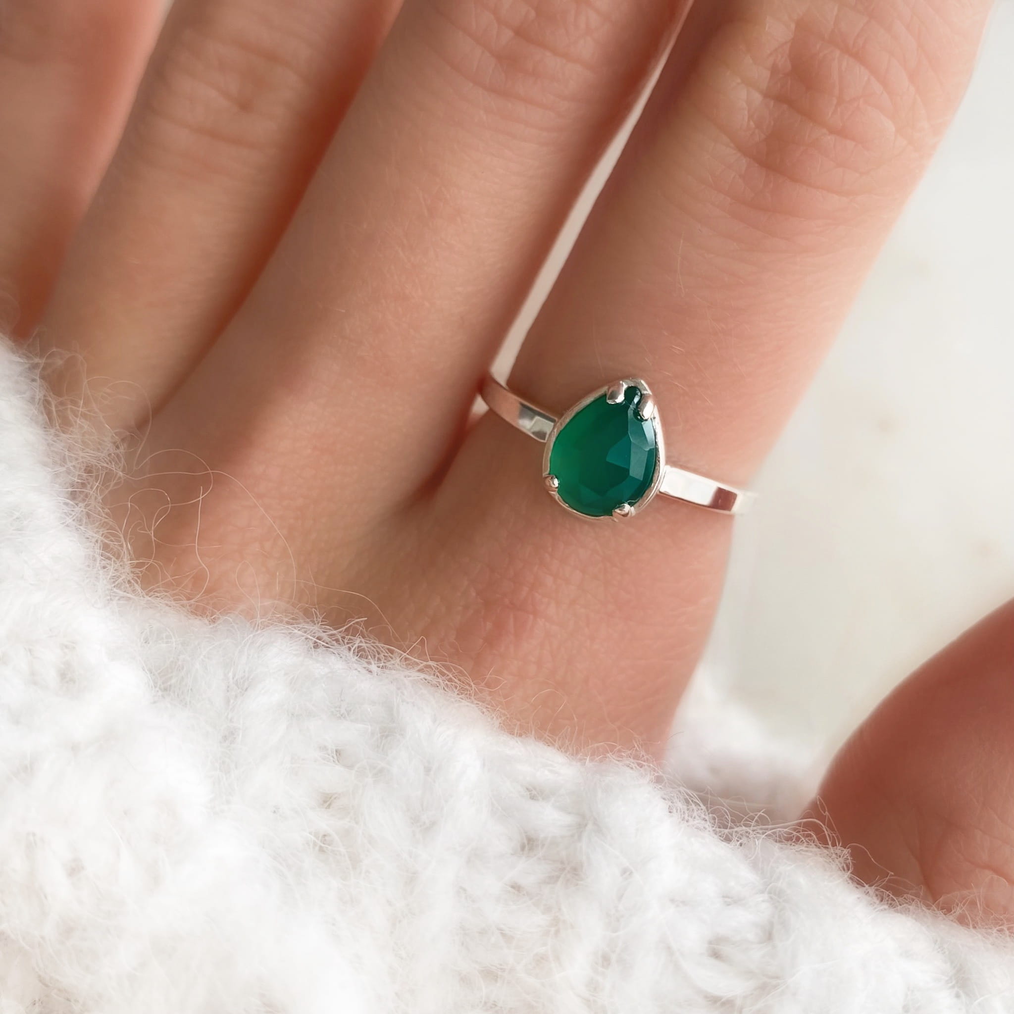 Pierścionek składa się z agatu zielonego zamkniętego w srebrnej oprawie próby 925.