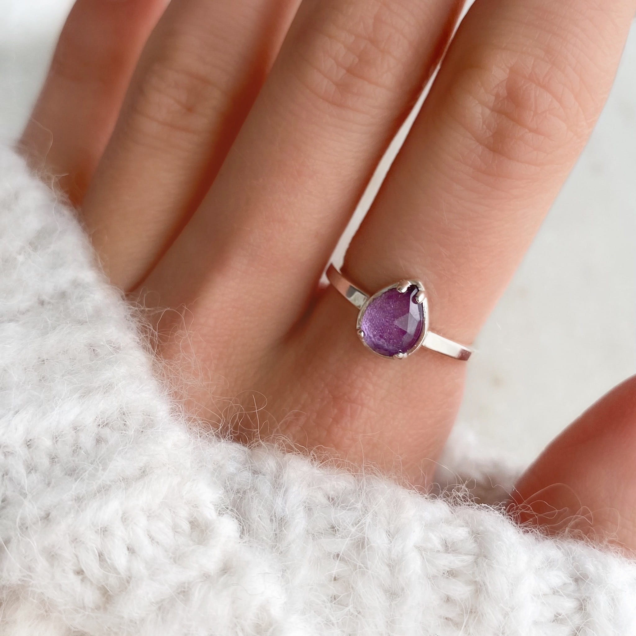 Pierścionek składa się z ametystu zamkniętego w srebrnej oprawie próby 925.