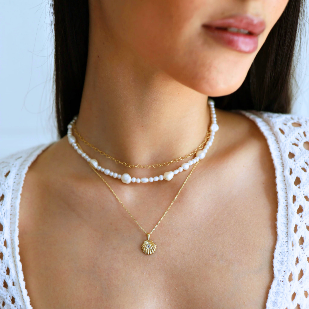 Ten subtelny naszyjnik z zawieszką w kształcie muszli kryje w sobie naturalny kamień księżycowy – minerał kojarzony z kobiecością, intuicją i wewnętrznym światłem. Jego delikatna opalizacja zmienia się wraz ze światłem, przyciągając spojrzenia i wprowadzając aurę spokoju.