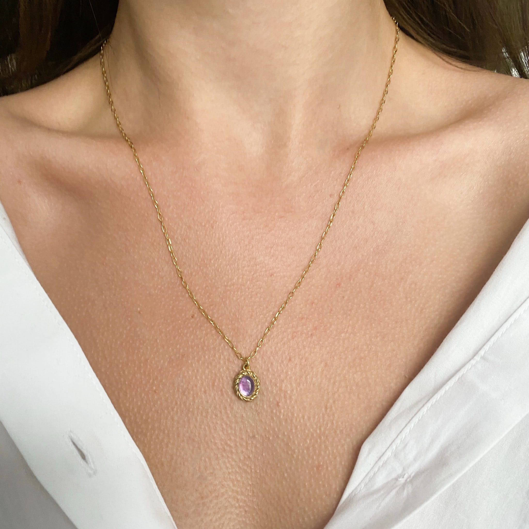 Naszyjnik składa się z ametystu, złotej zawieszki w stylu vintage oraz łańcuszka (próba 585).