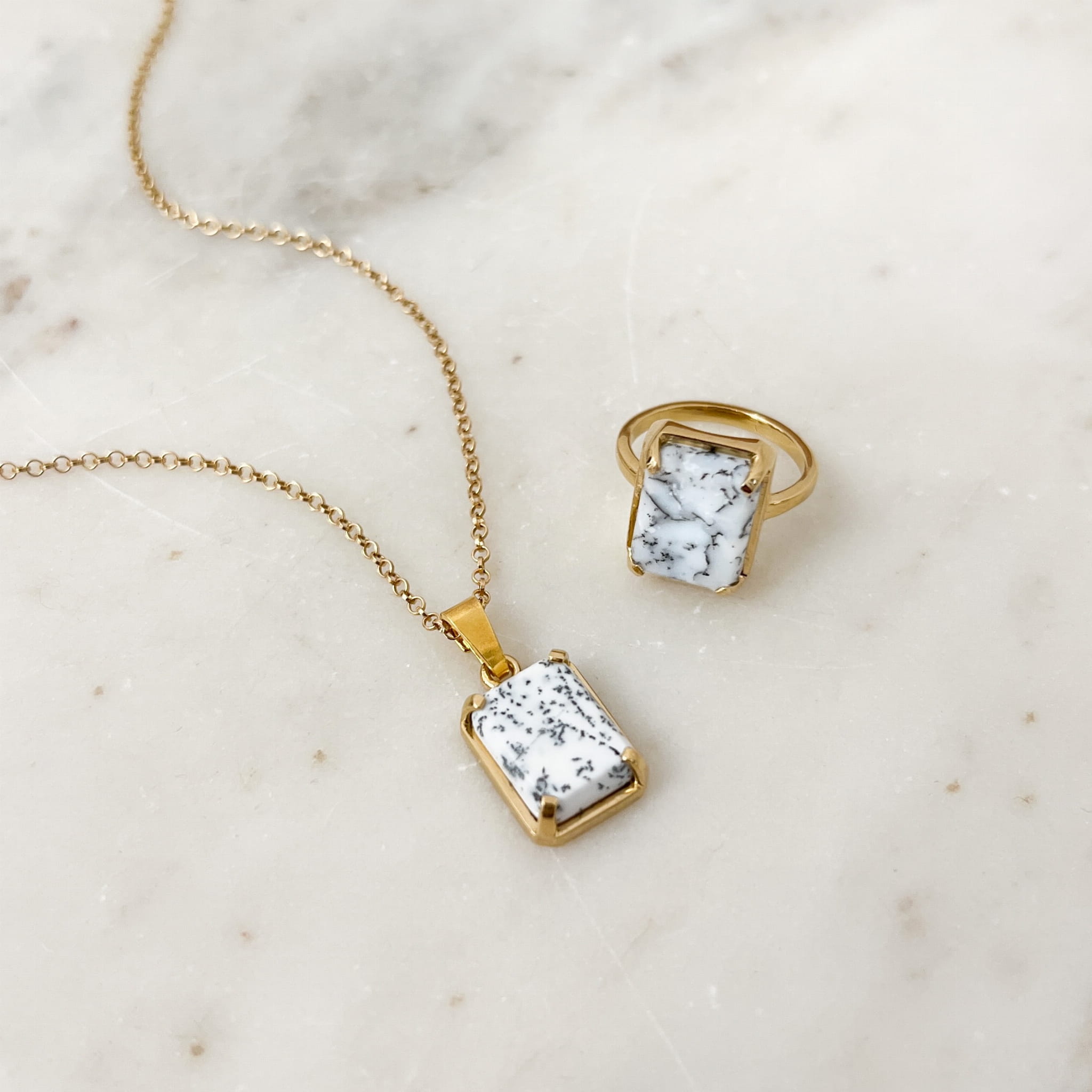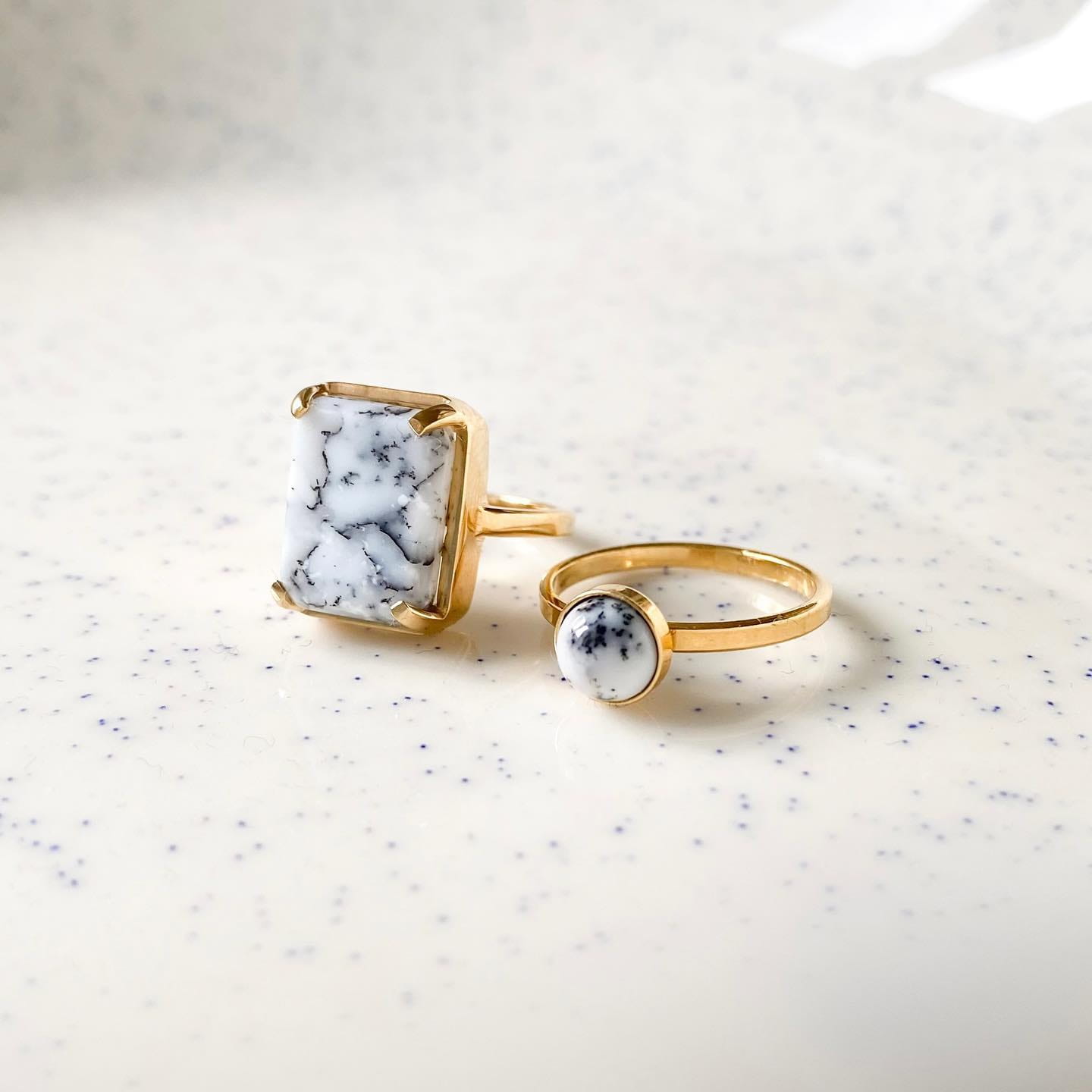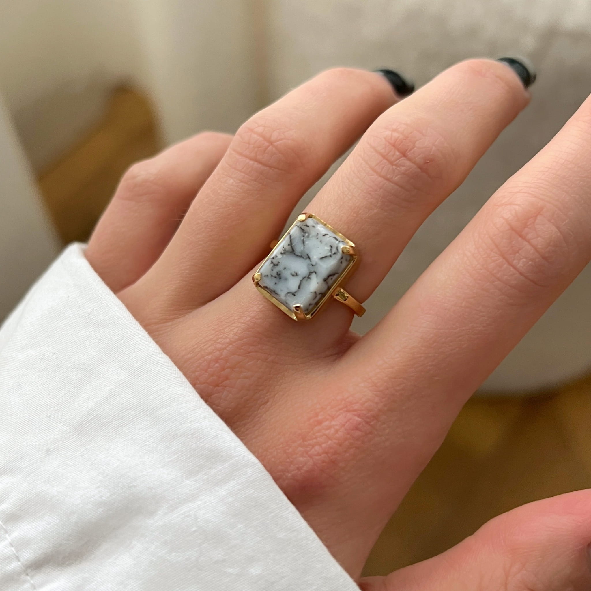 Pierścionek składa się z agatu dendrytowego oraz złota (próba 585).