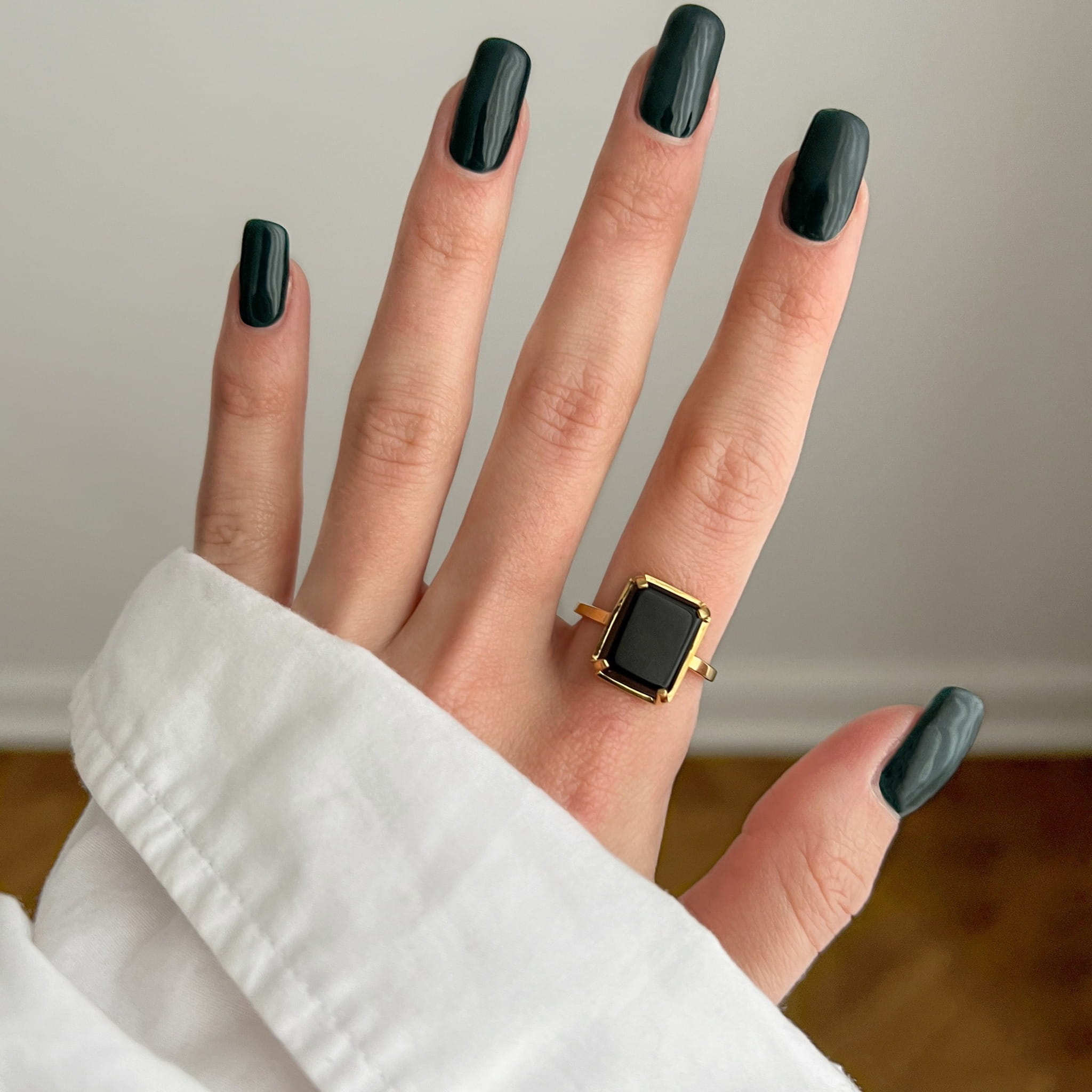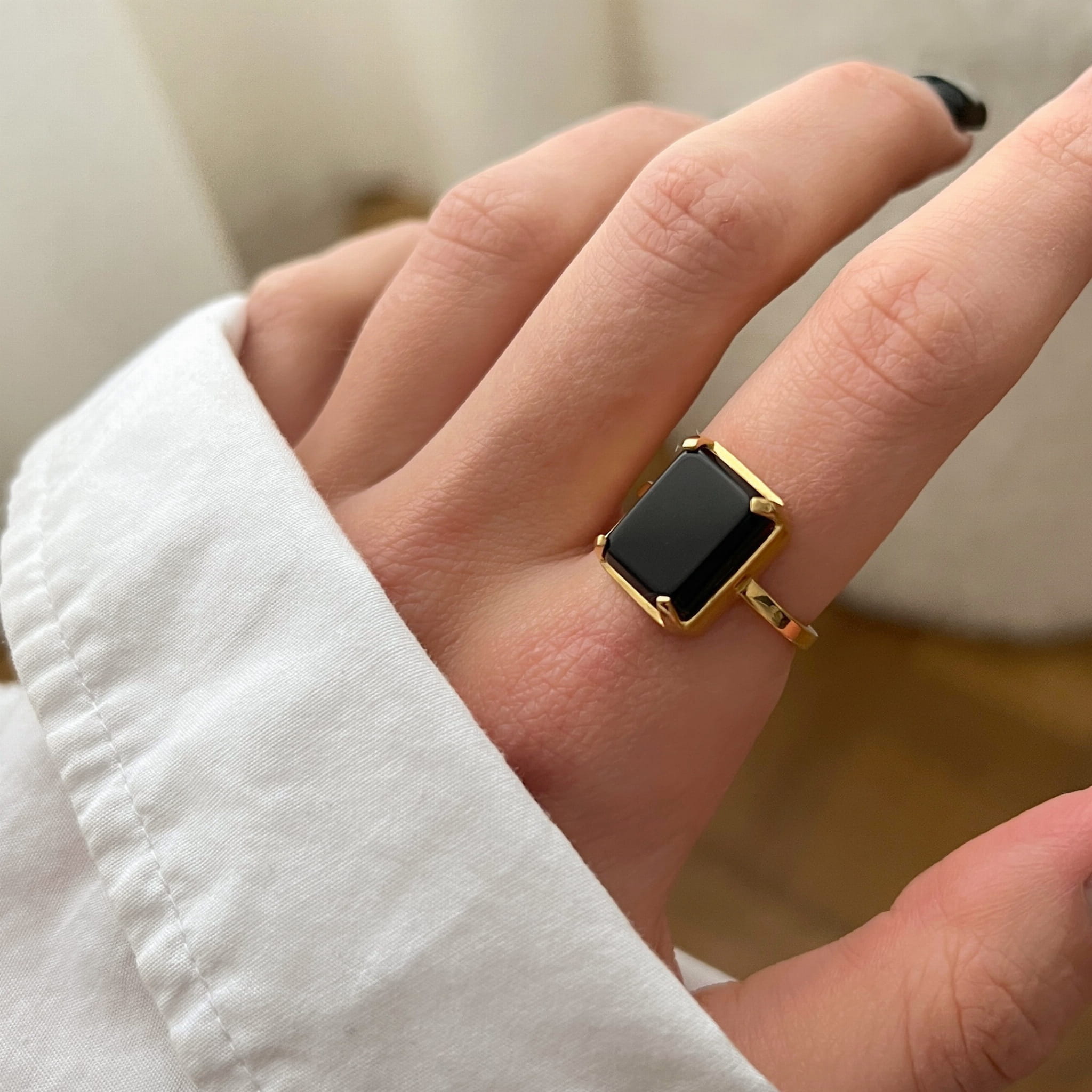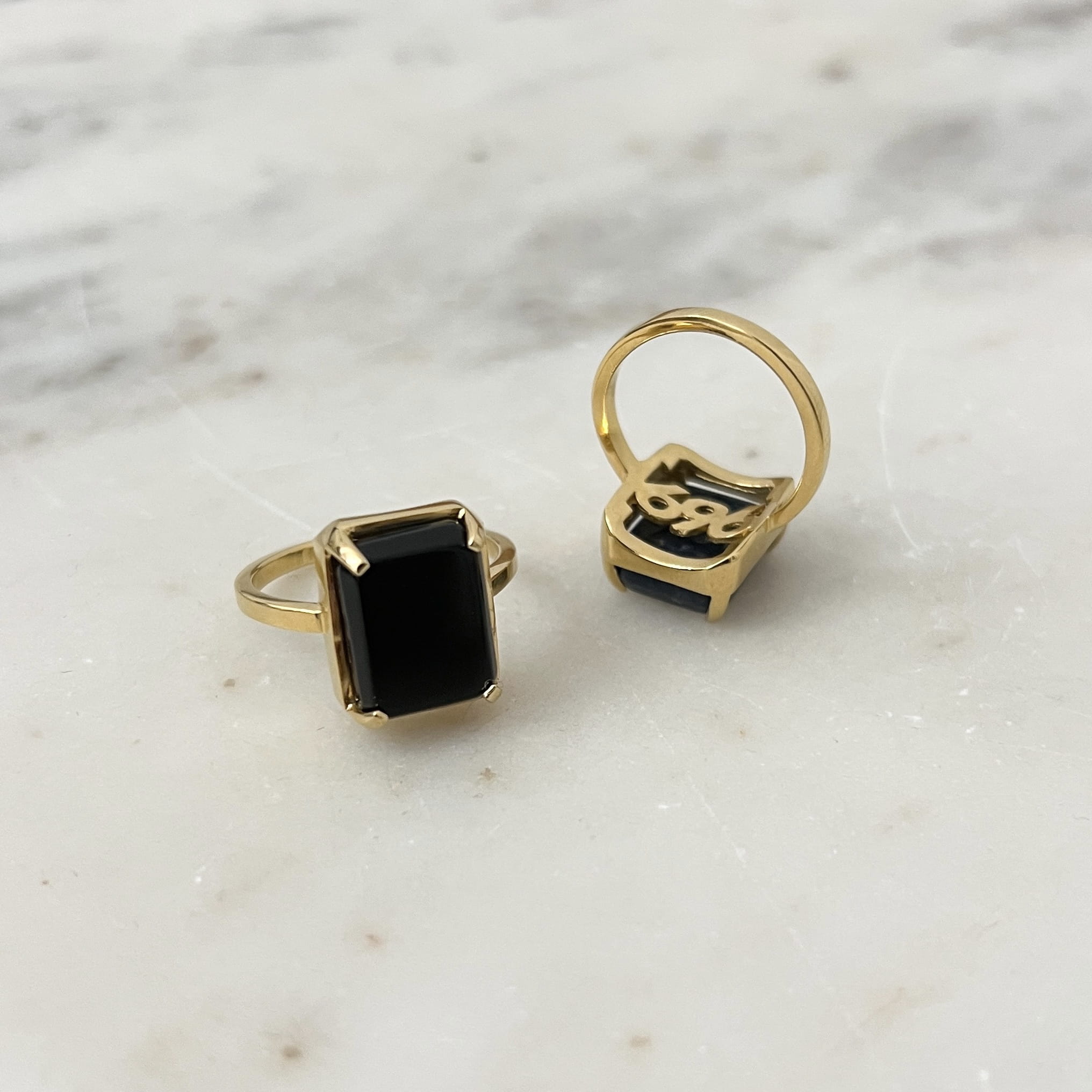 Pierścionek składa się z onyksu oraz złota (próba 585).